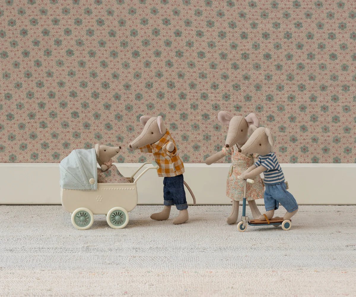 A kickboard with wooden details. The kickboard has a metal stick in the handlebars that makes sure mice with magnets in hands can stay on the board. A small elastic is added on the board and will secure the feet on the board during the ride.