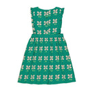 Knee-length all-over printed cotton voile dress. Top front with inlaid English embroidery and ruffled armholes. Round collar and button back. High waist with elasticated back and gathered skirt.