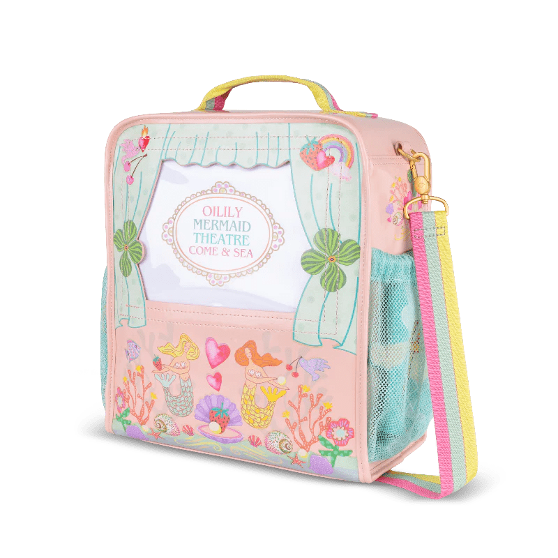 Oilily mermaid theatre handbag for endless play and creative imaginations. Your little one can direct their very own production on the go! This tote features a long removable strap, 2 side mesh compartments, a carry handle, and two zips to the back. The roll-up front opens to reveal a large inside compartment with two puppets: one mermaid and one merman.