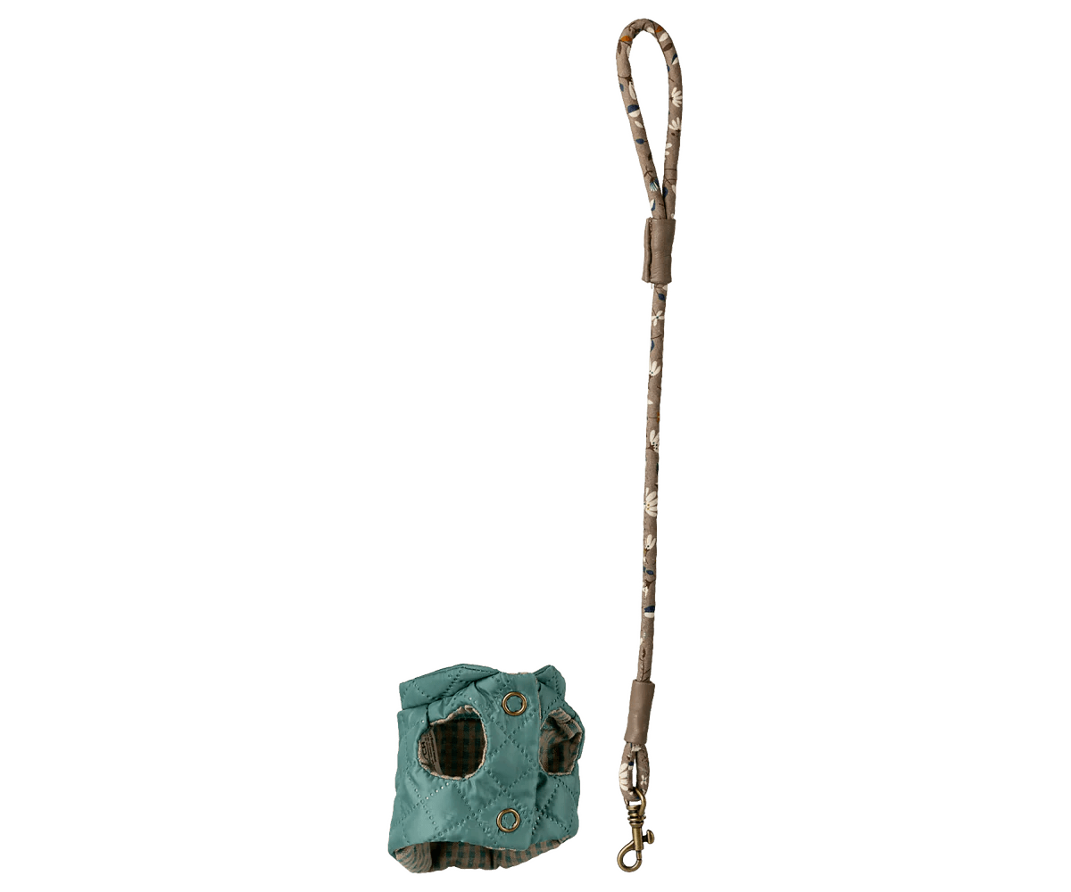 Extend playtime and take your favourite Maileg companion on a walk! The set includes a quilted harness and a floral fabric leash, designed to fit small Puppies, small Sleeping Bunnies, and Sleeping Kittens in both small and medium sizes. Wherever an adventure may lead, your soft friend can come too!