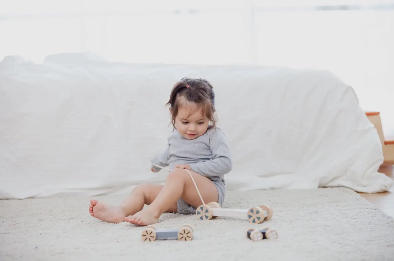 Children will enjoy the excitement of this wooden stacked rolling car pull toy. This toy has three cars that can be laced up, stacked on top of one another or played with independently. Each car has its one unique design in the wheel.