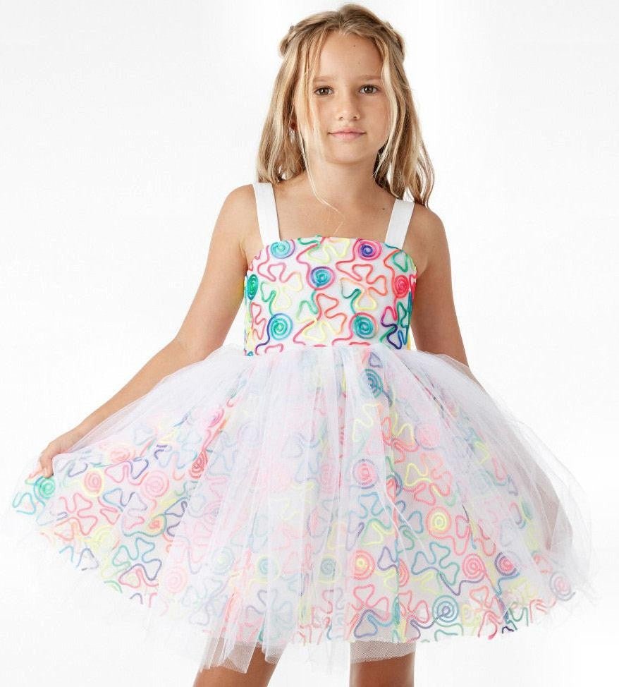 カラフルなお花の刺繍にチュールを重ねた華やかなドレスです。個性豊かな女の子のための愛らしいパーティードレス。バックの 3 つのボタン留め、幅広のストラップ ショルダー、フィットしたウエスト、フル スカート。