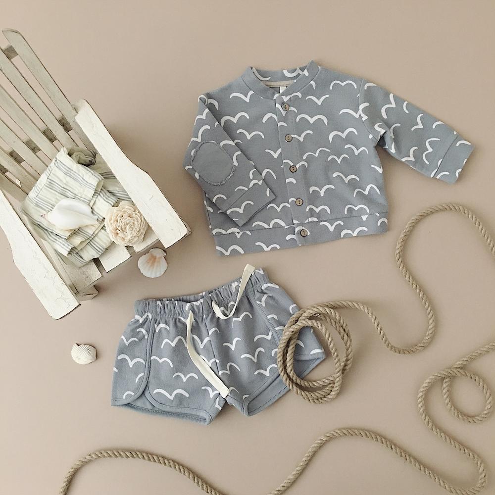 Baby cardigan with all over bird print with wooden buttons closure. Can be worn with or without a layering piece.